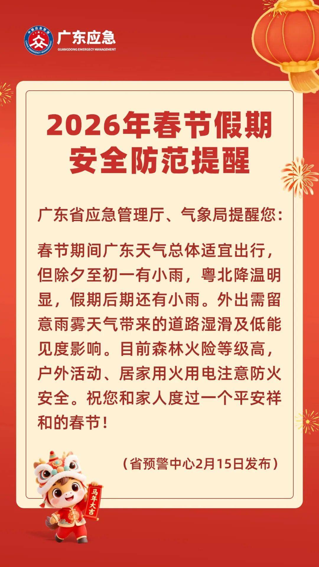 2月15日,广东省应急管理厅、气象局发布提醒:春节期间广东天气总体适宜出行,但除夕至初一有小雨,粤北降温明显,假期后期还有小雨。外出需留意雨雾天气带来的道路湿滑及低能见度影响。目前森林火险等级高,户外活动、居家用火用电注意防火安全。祝您和家人度过一个平安祥和的春节。