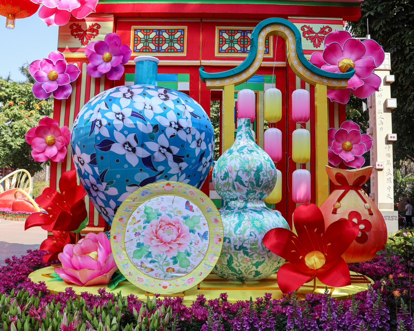 广府匠心,新春景组浓缩岭南文化。花会各景组匠心独运,将中国传统吉祥喜庆的文化元素与园林布置技艺相融合,在正门中轴线到中心广场区域以及各出入口打造了一系列富含岭南特色和年味浓郁的园林景组。从融合马年新春祝福和西关文化底蕴的门楼“福马迎春”,到以粤剧凤冠、镬耳墙勾勒广府特色的“粤韵悠扬”,再到展现粤港澳大湾区标志性建筑与灿烂繁花相映的锦绣图景的“春满繁花”,20余组特色景组串联全园,形成步移景异、花灯交融的视觉效果。其中,“福马迎春”是最具岭南特色的景组,采用趟栊门、满洲窗、生肖马、岭南佳果,以及广彩天球瓶、葫芦瓶、牡丹赏盘等丰富的广府元素,蕴藏马上“橙”功、福禄双全、花开富贵等传统好“意头”。