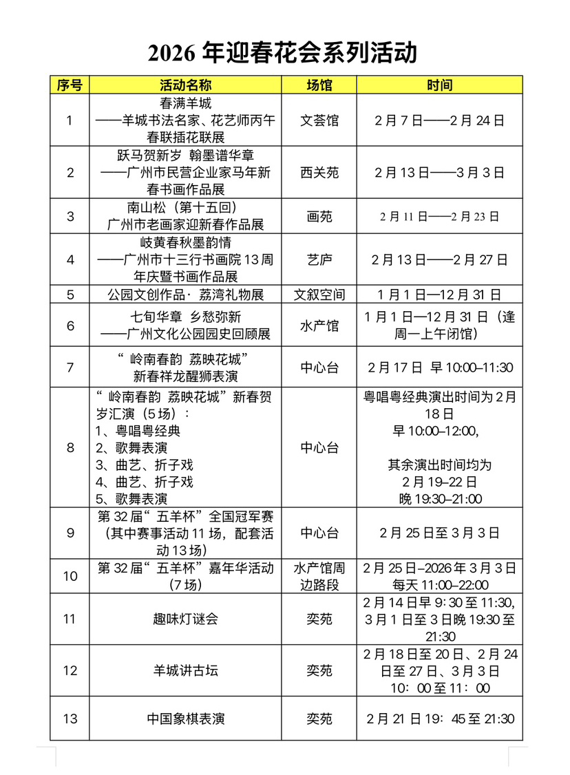 广州文化公园2026年迎春花会以“岭南春韵 荔映花城”为主题,展出时间为2026年2月16日(除夕)至3月3日(正月十五),其中元宵灯会亮灯时间为2月25日(正月初九)至3月3日(正月十五)晚。今年花会共展出22组花灯结合的园林景组(灯组),桃花、桔果及各类精品花卉逾2.2万盆,各类构件、饰物1800多件,延续“广州过年、花城看花”的特色传统。同时配以书画展览、文艺演出、挥春送福、讲古灯谜等文化活动,为广大市民游客奉上一场新春文化盛宴。