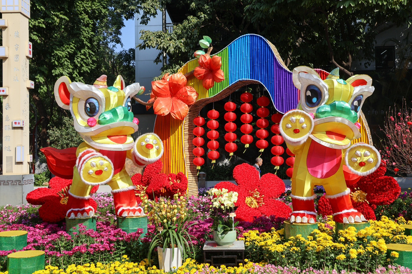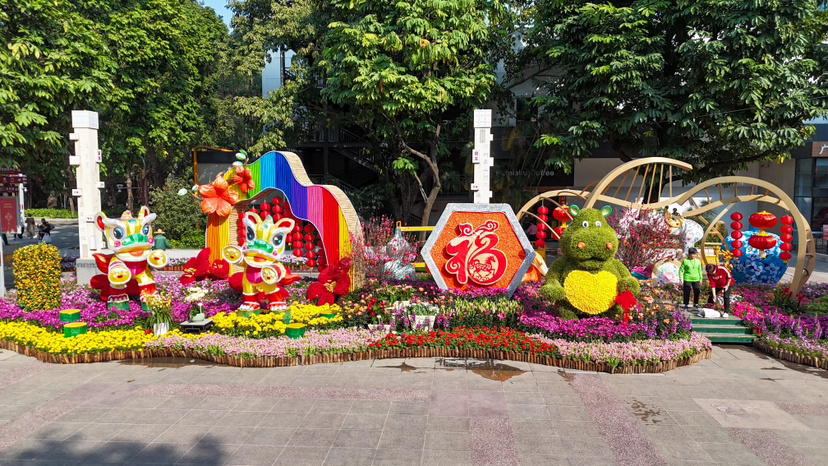 马跃春风,传统元素点燃节庆欢腾。西南广场“马跃福至”主题景组以书法五福、新年吉语演绎岭南年味。景组以名家的手写“五福”为核心,将“福”字这个最质朴的愿望变得触手可及,让市民游客在合影打卡时,就能把“五福临门”的好意头“框”回家。迎春花会首次展出的双色喜炮凤梨,花序酷似一串串鞭炮,寓意“喜炮”一响,好运登场;巨型鸡冠花以昂扬之姿恭祝大家新一年里昂首向上,鸿运当头。春节期间来文化公园十三行印迹园内的凉圃,还能邂逅多款精品品种菊绽放的盛景,赴一场菊韵新春之约。