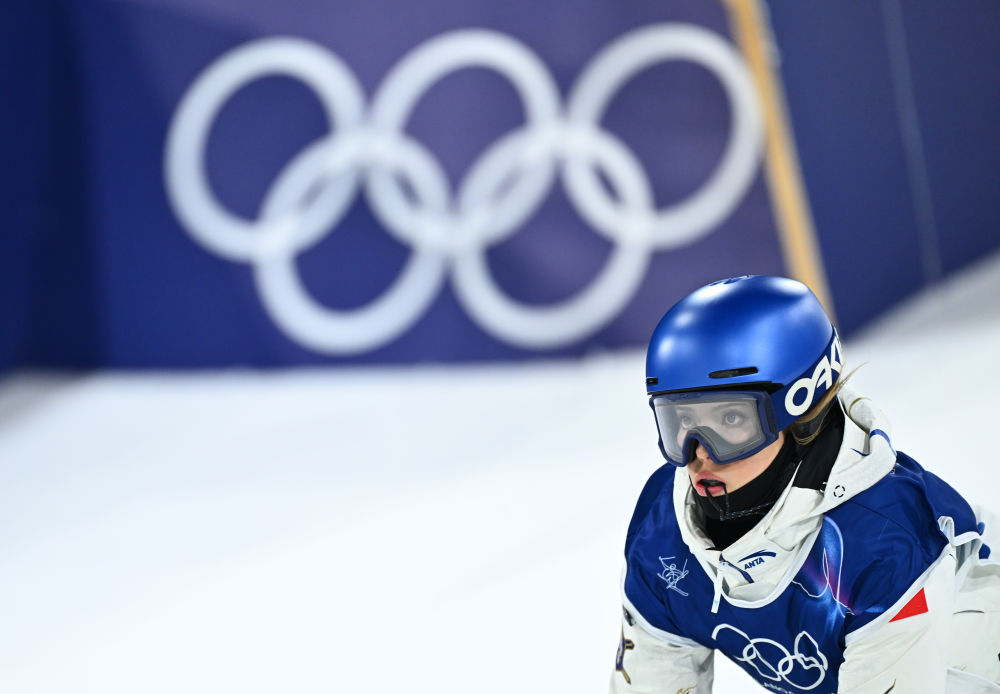 2月14日,中国选手谷爱凌在女子大跳台资格赛中。新华社记者 张宏祥 摄