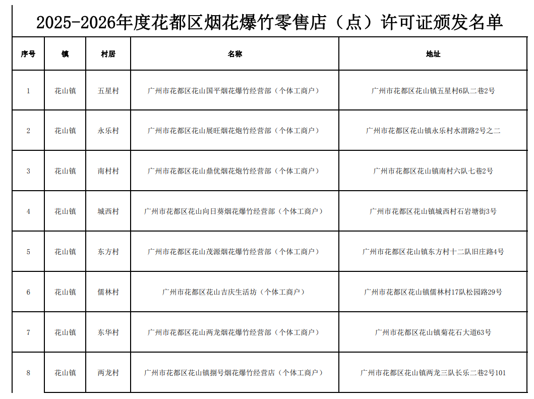 如何查找?可通过“广州市花都区人民政府”门户网站发布的零售店(点)名单、关注“广州花都发布”“花都应急管理融媒”等平台获取2025—2026年度花都区烟花爆竹经营(零售)许可信息,或直接使用手机导航软件(如高德地图、百度地图等)搜索关键字“烟花”,即可便捷查询附近合法销售烟花爆竹的零售店(点)的准确位置与导航路线。