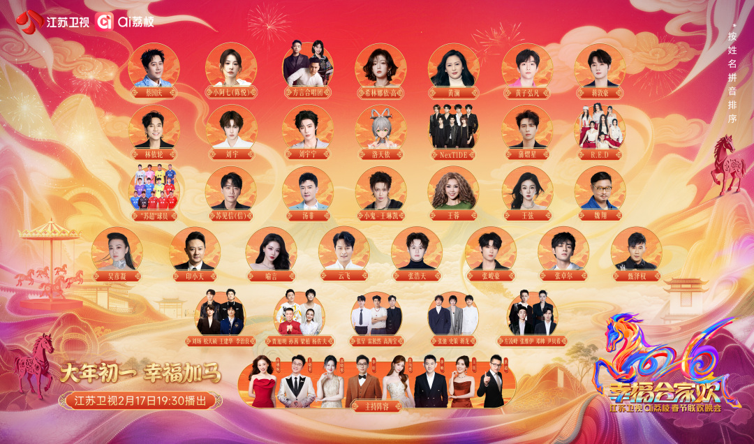 2月16日,《幸福合家欢・2026江苏卫视ai荔枝春节联欢晚会》正式发布全阵容海报,晚会将于2月17日大年初一19:30跟观众见面。