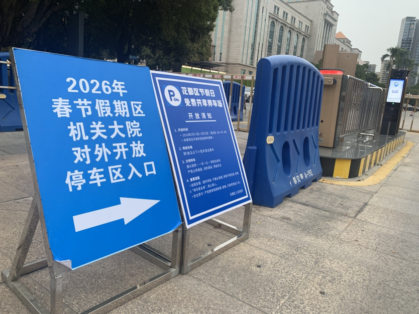 2月17日下午,记者驱车来到花都区人民政府大院。在公益路上大院入口处,放置有“2026年春节假期区机关大院对外开放停车区入口”指示牌,按箭头方向,就可以通往停车区。保安管理人员进行简单的车辆和人员信息登记后,记者即驱车直入停车区。