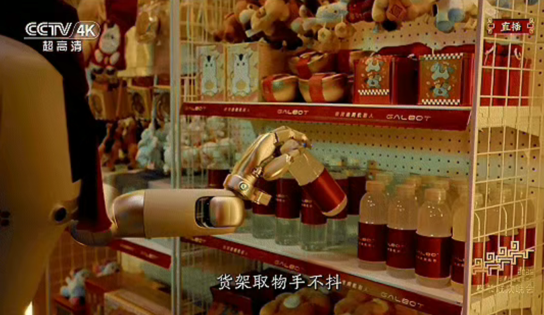 比如在春晚舞台上,“小盖”需要从货架上取下一瓶矿泉水。这看似简单的动作,实则暗藏玄机——水瓶被紧密排列在货架层板之间,周围商品间距极小,稍有不慎便会碰倒邻品或抓取失败。这要求机器人必须同时处理三重难题:一是通过大脑精准判断水瓶在货架上的位置;二是用拟人的动作伸手拿到水瓶,并且过程中不能碰倒周围的商品;三是灵巧操作,水瓶上半身较细、下半身较粗,且通常被紧密卡位,直接平移取出极易卡顿。