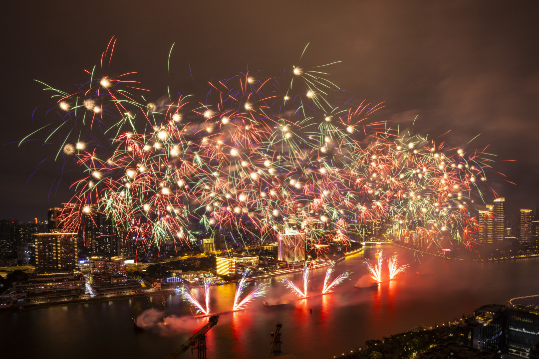 第一篇章“粤彩飞扬 潮涌新篇”,以烟花描绘高质量发展斑斓画卷。