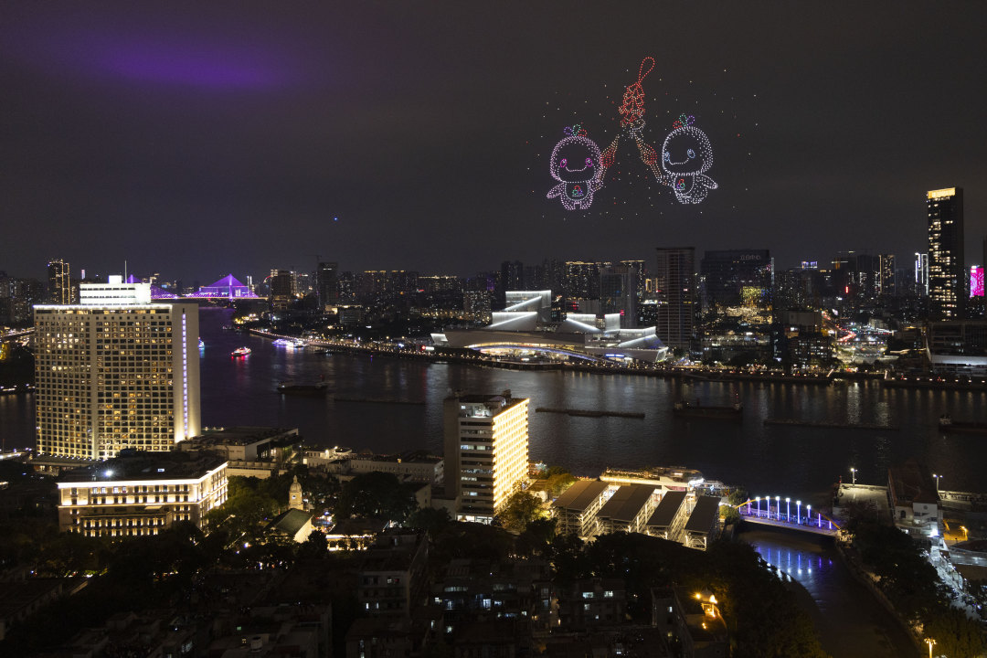 无人机编队首先演绎了岭南神兽“鳌鱼”,以其“独占鳌头”之姿,礼赞广州奋勇争先、追求卓越的精气神。