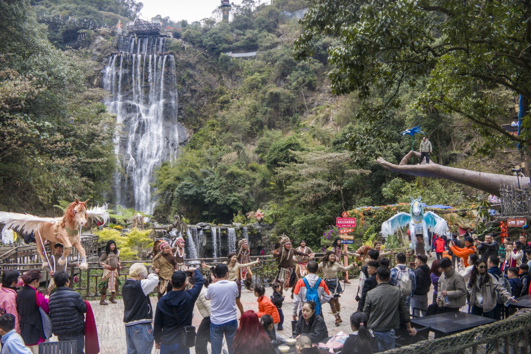 今年,古龙峡景区在省内率先推出全时全域丛林情景演艺,成为新年打卡热点。踏入1168亩原生态丛林峡谷,晨光祝祷的悠远歌声在山谷间回荡,身着兽皮装扮的部落演员列队迎福,擂鼓战舞贺新春,奇趣互动让游客直呼过瘾。45米宽瀑布边,部落演员与游客携手共舞,水雾光影间尽显新春欢腾。登顶云天玻霸,云端吟唱伴高空观景,随机现身的NPC带着马年惊喜任务,与游客合影解锁新年彩蛋,云端纳福趣味十足。
