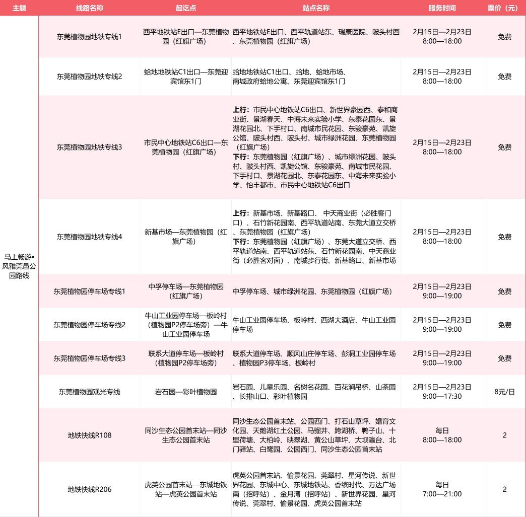 为大力引导市民绿色出行,东莞巴士在植物园片区开通4条地铁接驳专线及3条停车场专线,专线覆盖西平、蛤地、市民中心等轨道站点,春节期间票价全免。园内还设有串联岩石园、名树名花园、百花涧等网红打卡点的观光专线,一票通8元/日,让市民从从容容游园、轻轻松松往返。