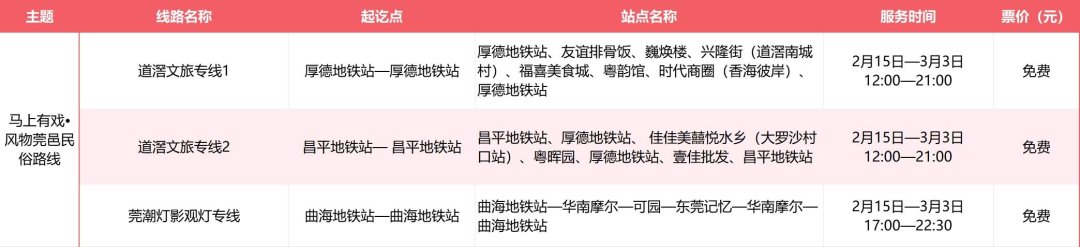 道滘文旅专线1、2以厚德、昌平地铁站为枢纽,免费接驳市民前往巍焕楼、粤晖园、兴隆街、粤韵馆等游玩景点,沿途串联起本土美食与岭南水乡风情。莞潮灯影观灯专线则从曲海地铁站发出,经华南摩尔、可园、东莞记忆,全程免费运营至22:30,为市民夜游灯会提供便捷服务,点亮莞邑夜间经济。