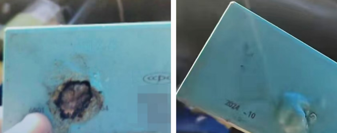 卡片一面被烧,形成孔洞,露出了里面的芯片,另一面的塑料外壳则出现了大小不一的鼓包。