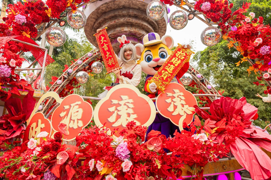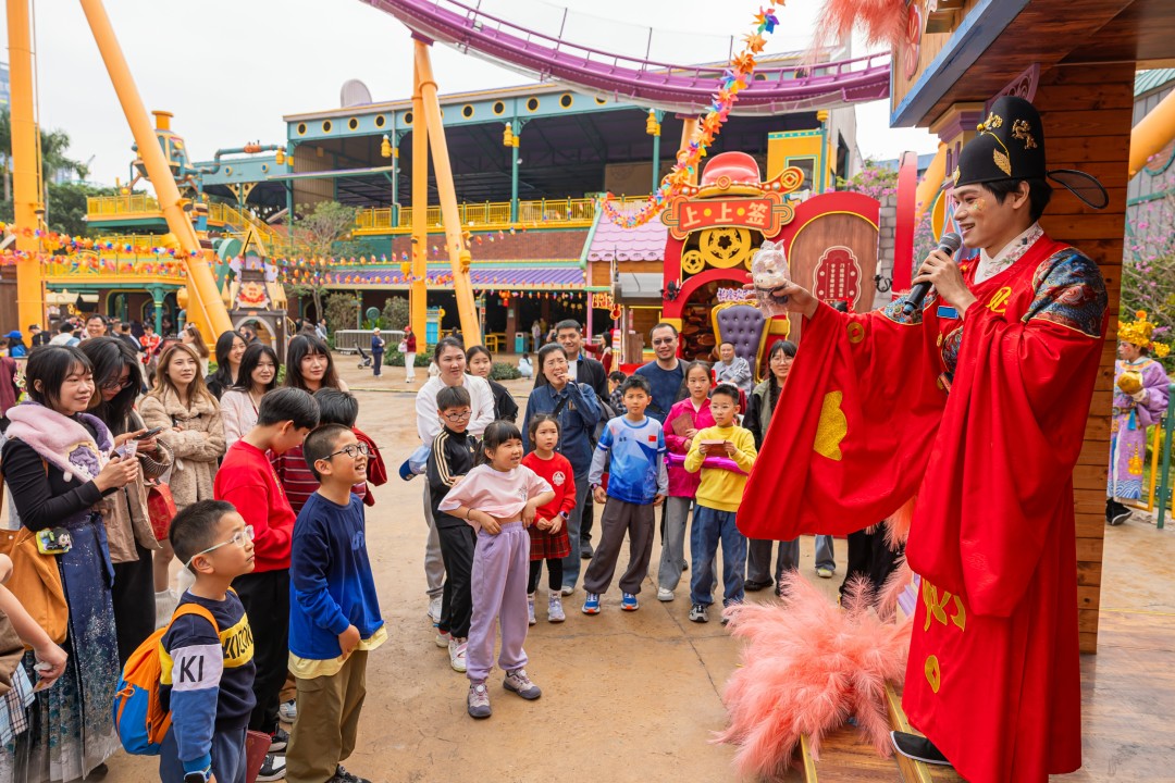 精彩的活动直接带动了客流高峰。步入长隆欢乐世界,游客沉浸式感受年味十足的“欢乐财神村”。园区内,气势磅礴的英歌舞、寓意美好的“抢包山”实景再现,流光溢彩的鳌鱼灯展等多项非遗展演轮番登场,全方位展现地道广府年的热闹与喜庆。游客们沿着“八方接财”福气路线,亲手体验许愿灯、非遗拓印画,漫步花街,在欢声笑语中沉浸式感受传统与现代交融的新春氛围。