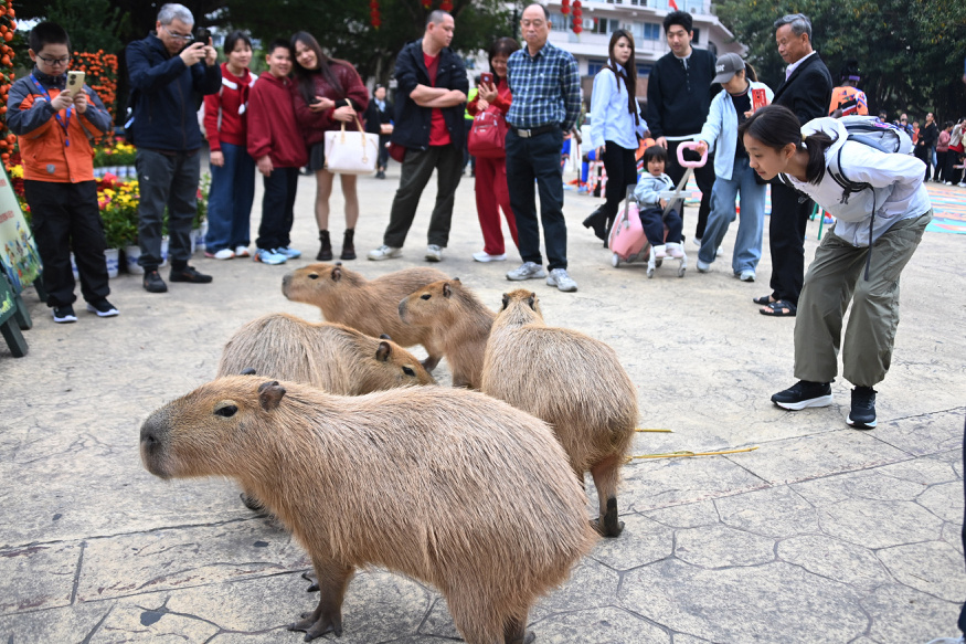 记者在动物园里看到,园内的“骏马”、水豚“卡皮巴拉”、鹈鹕等动物,在工作人员的带领下巡游上演别开生面的“迎宾秀”,游客近距离与可爱的动物互动,现场洋溢着欢乐的气氛。