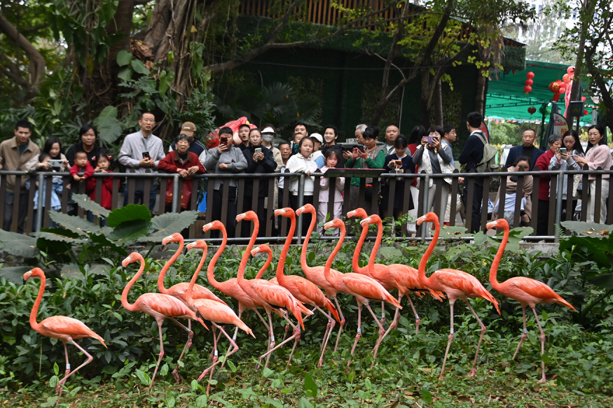 园内湿地里的火烈鸟“红红火火”,它们在草地上排列行走,仿佛列队迎接八方游客,显现喜气洋洋,生机勃勃的新年氛围。