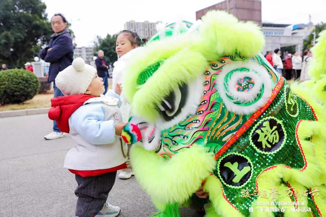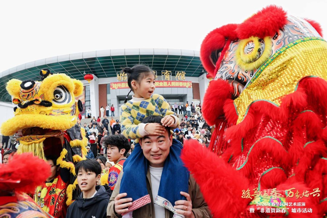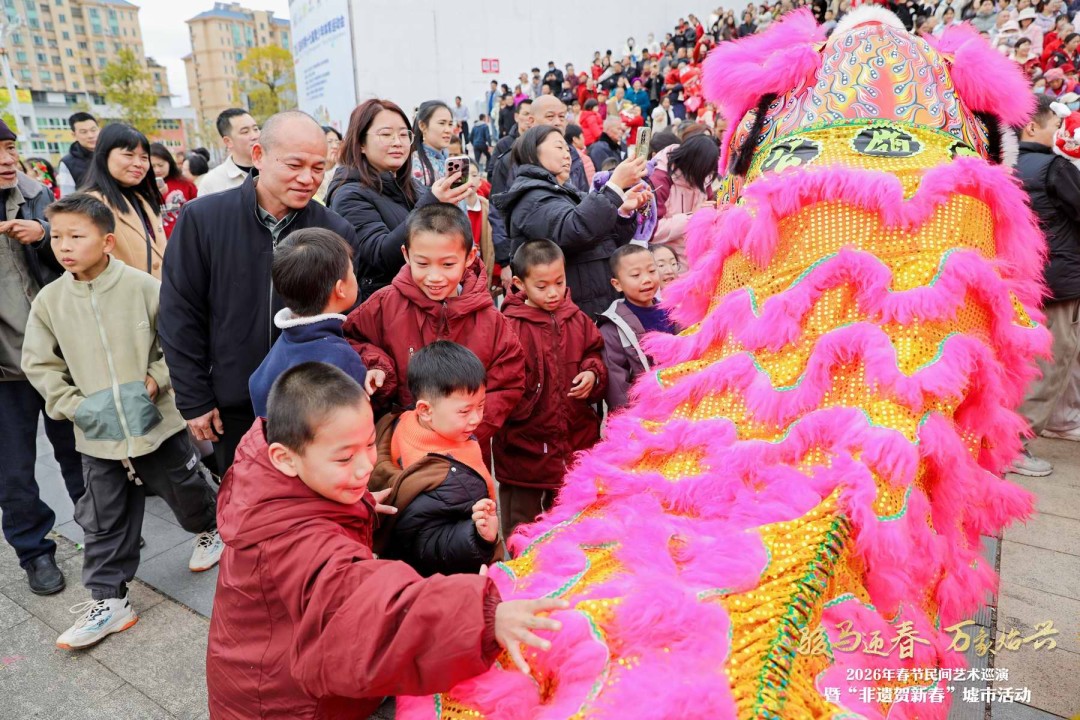 如果说乡村的巡游是关于“变迁”的赞歌,那么县城的巡演则是关于“坚守”的史诗。同日上午,始兴县城内锣鼓喧天,“骏马迎春 万象始兴”2026年春节民间艺术巡演暨“非遗贺新春”墟市活动盛大启幕。13支巡演队伍,宛如13条流动的文化血脉,沿着九龄广场至始兴体育馆的城市轴线,铺展出一幅流动的民俗画卷。