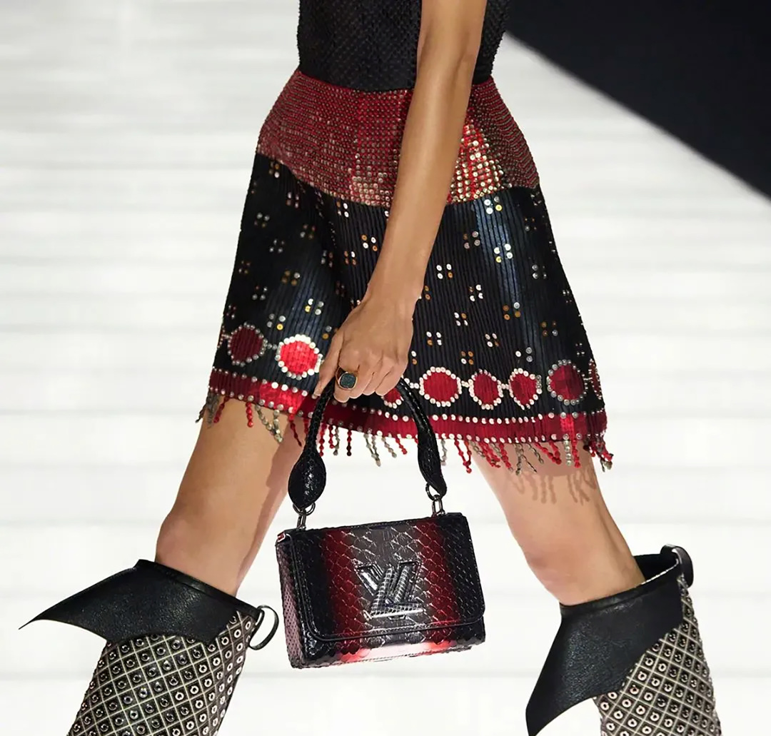 时尚博主张婷表示,LV本季45套造型尽显当代女性的多元力量,而最动人的设计,莫过于对“光线”的极致表达:钉珠刺绣折射灵动目光,金属材质化作流动光幕,利落皮革刚柔并济,态度与温度兼具。她认为,宫廷斗篷、盔甲廓形、几何拼接与飒爽长靴,均十分适配新春假期;若结合东方审美点缀红、紫等配饰,更能呼应节日氛围,氛围感与实穿性双双拉满。