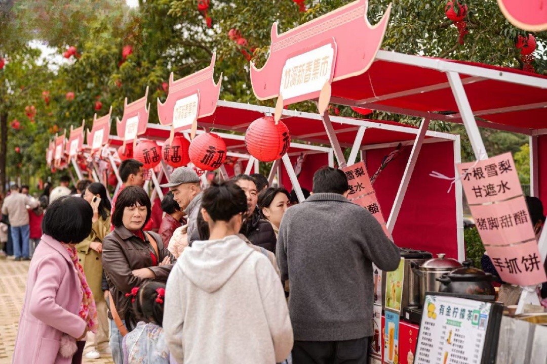 新春流萤市集是当天人气最旺的区域。艾糍、猪脚甜醋、糖画等竹洞地道小吃热气腾腾,竹编、鱼灯等手工艺品琳琅满目。记者注意到,半数以上摊位由本村村民经营。“以前过年就是走亲戚,现在在家门口就能赚钱。”村民吴大姐的摊位前,现做的猪脚甜醋不到两小时就售罄。这些自发参与的村民摊位,成为项目带动乡村活力的生动注脚。暮色四合,竹洞湖畔营地响起民谣旋律。流萤许愿池灯光璀璨,游客提鱼灯漫步,光影倒映湖面,呈现“水陆辉映、流光溢彩”的夜游图景。生态底色:国企匠心守护慢生长与常规开发模式不同,竹洞项目坚持“轻介入、慢生长、重生态”。
