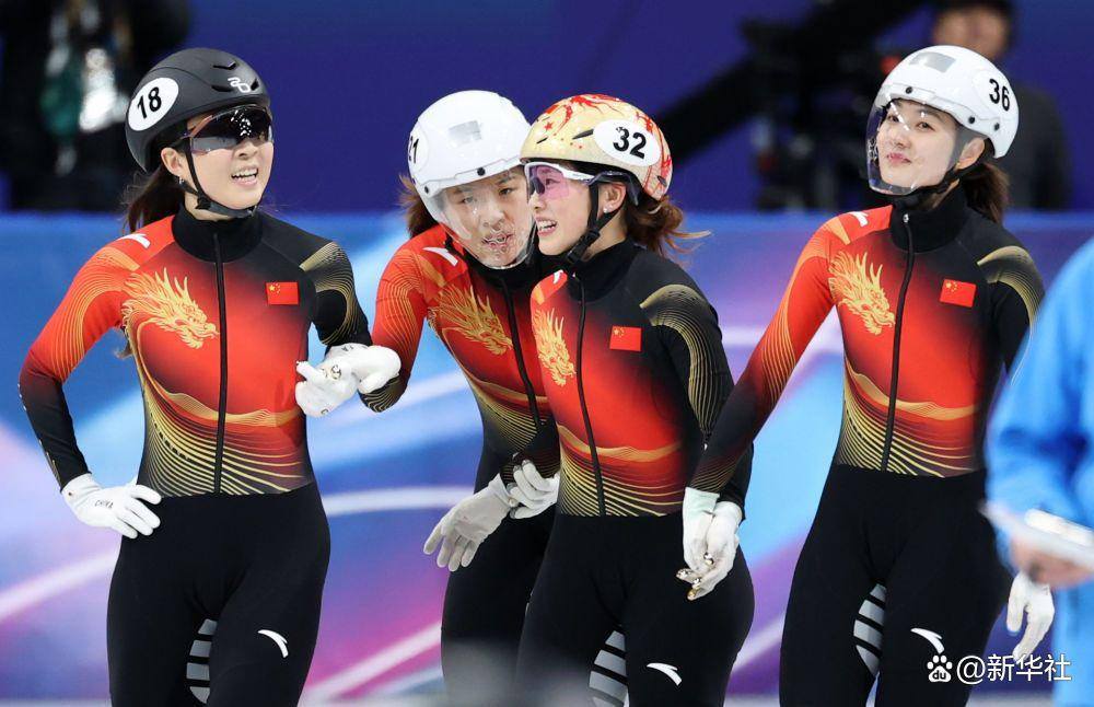 2月18日,中国队选手公俐、张楚桐、杨婧茹和王欣然(从左至右)在女子3000米接力B组决赛后。新华社记者 李明 摄