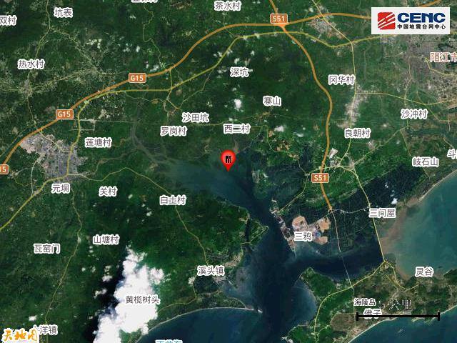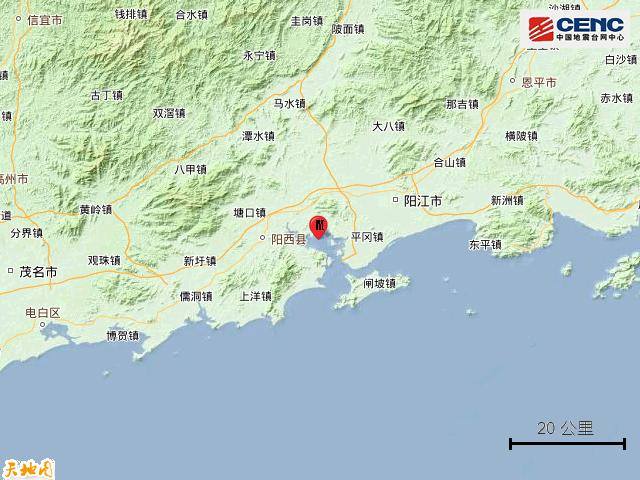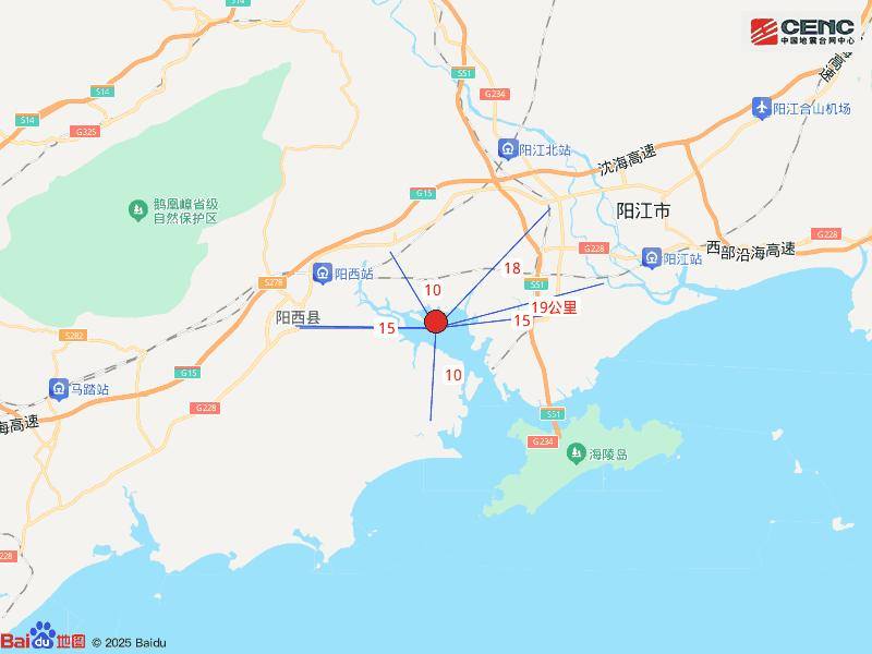 震中距阳西县16公里、距江城区23公里、距阳东区28公里、距阳春市47公里、距恩平市73公里,距阳江市25公里,距广州市217公里。