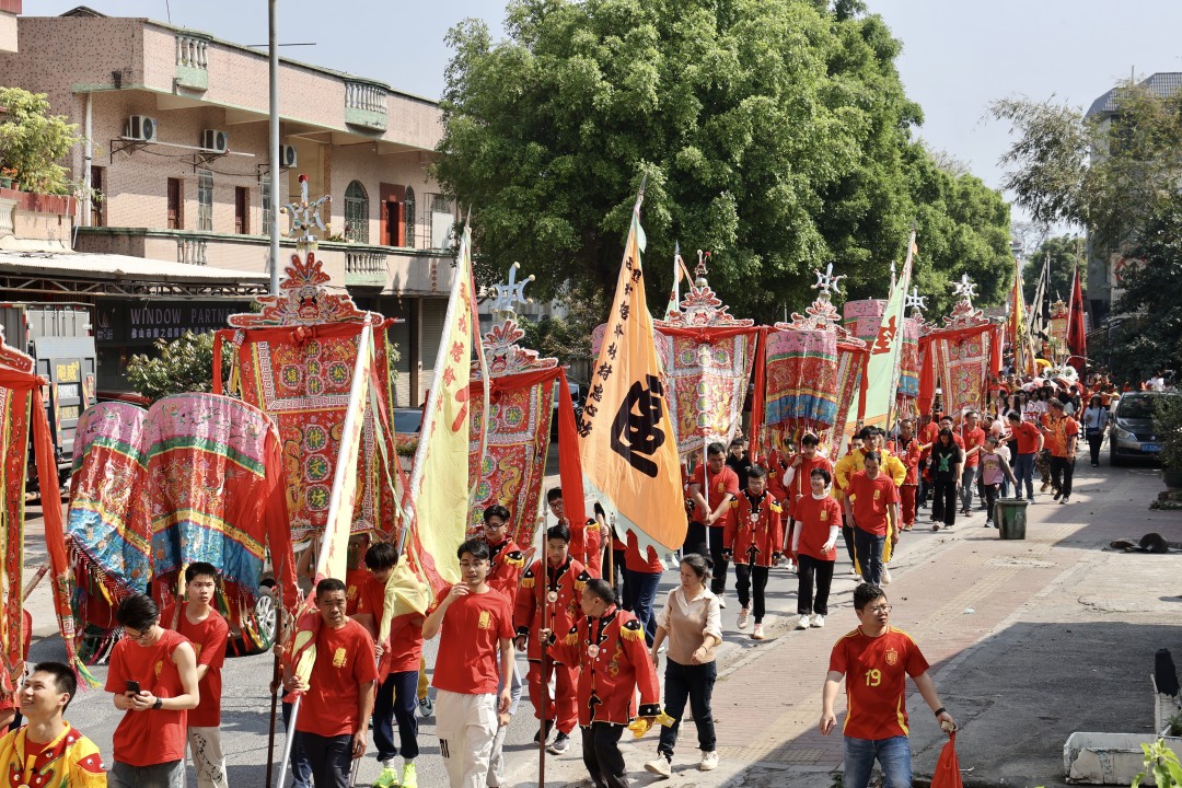 作为松塘先贤创立的民俗瑰宝,“出色”巡游承载着古村文化根脉与乡愁。当日13时许,区氏宗祠前,巡游队伍整装待发,10头醒狮闻声起舞,灵动采青瞬间点燃现场氛围,近万名观众的欢呼声、喝彩声此起彼伏,响彻古村街巷。醒狮献瑞后,两面醒目的“区”字大灯笼昂首开路,社稷、北帝、华光、文昌、关帝等各路神像依次列队,各坊罗伞彩旗迎风招展,村民身着传统华服、手持兵器帅牌稳步推进,狮队压轴殿后,整个队伍庄严肃穆又气势恢宏,尽显民俗底蕴。