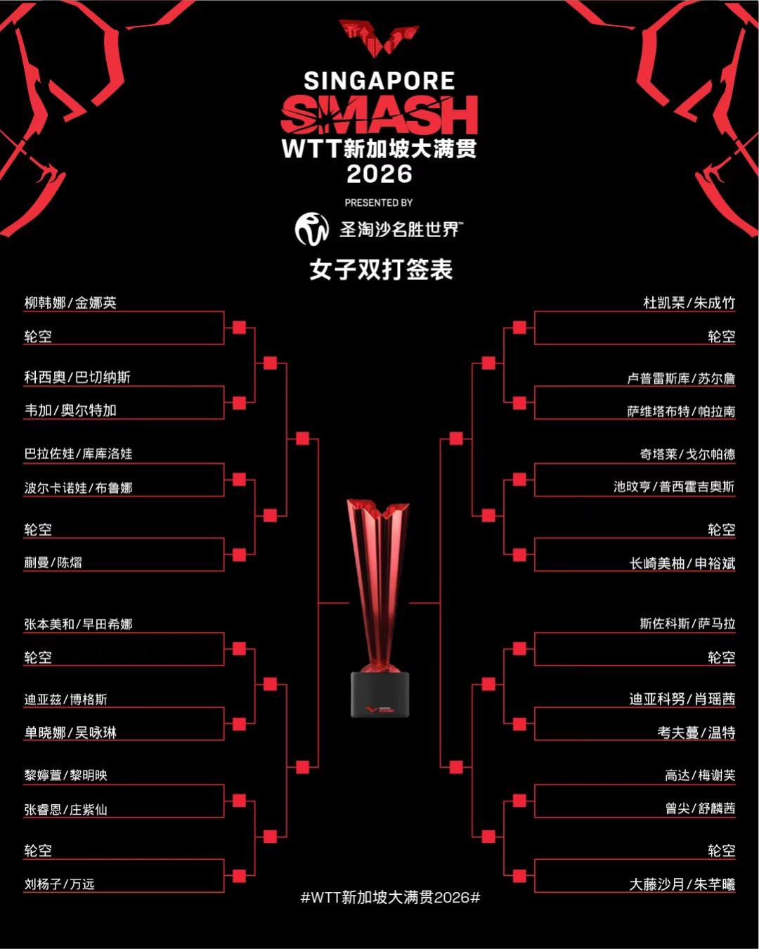 WTT新加坡大满贯于2月19日至3月1日举行。女双正赛抽签结果已经揭晓,中国队只派出一组合参赛,蒯曼/陈熠位列上半区。