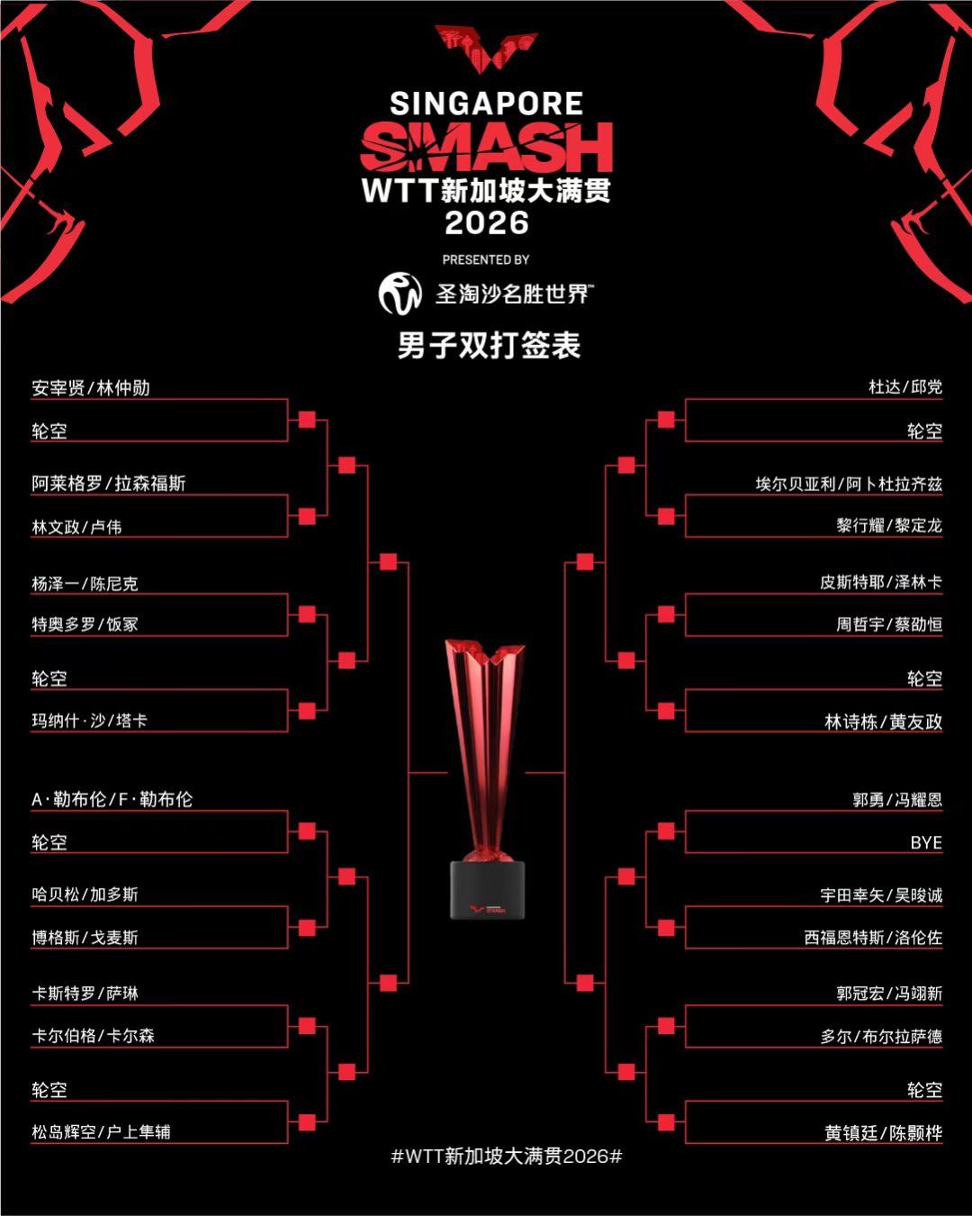 WTT新加坡大满贯于2月19日至3月1日举行。男双正赛抽签结果已经揭晓,中国队只派出一组合参赛,林诗栋/黄友政位列下半区。