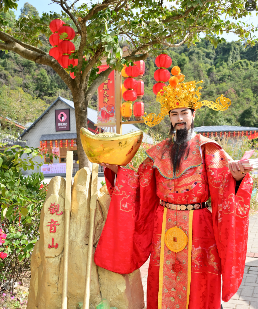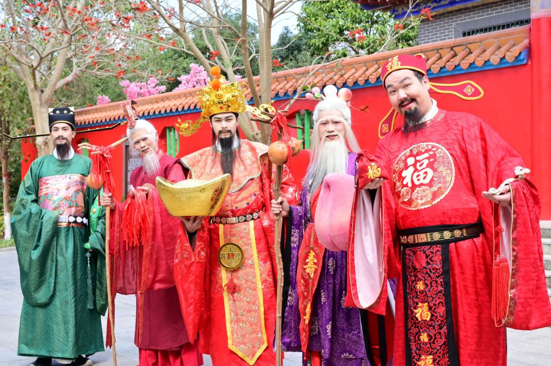 除了财神,由福星、禄星、寿星、喜神组成的“五福天团”也齐齐降临福山,在景区各处与游客花式互动。福星送出观音山专属马年福字贴,禄星手中的如意被游客争相抚摸祈愿步步高升,寿星的大寿桃前更是排起长队,大家纷纷摸一摸讨个健康长寿。喜神则在姻缘打卡点向单身游客赠送姻缘红绳,祝福他们早日脱单。