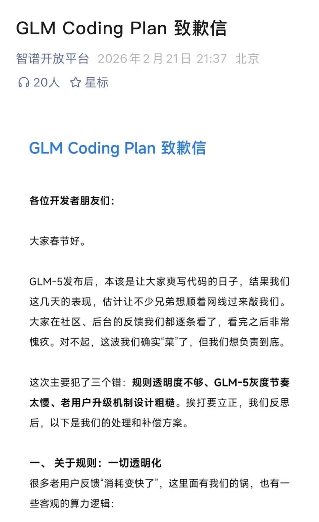 在2月21日发布的《GLM Coding Plan致歉信》中,智谱承认了在GLM-5发布后犯下了三个关键错误:
