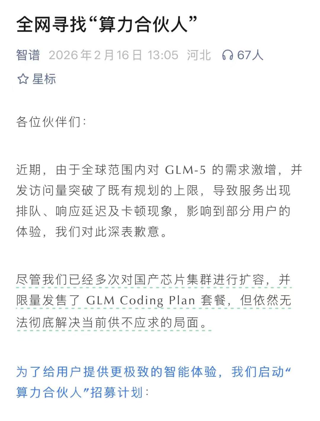 在算力保障层面,记者注意到,智谱于2月16日发布了全网寻找“算力合伙人”的计划。近期,由于全球范围内对GLM-5的需求激增,并发访问量突破了既有规划的上限,导致服务出现排队、响应延迟及卡顿现象,影响到部分用户的体验。