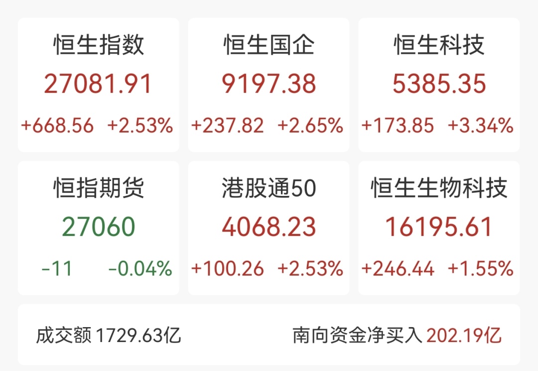 2月23日,港股市场全天强势震荡,三大指数高开高走。Wind数据显示,恒生指数涨2.53%,重回27000点,收报27081.91点,恒生科技指数涨3.34%报5385.35点,恒生中国企业指数涨2.65%报9197.38点。市场成交额约1730亿元,南向资金净买入202亿元。
