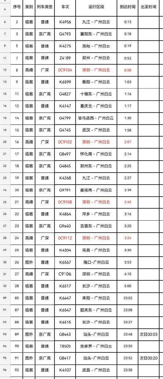 据悉,在春运等客流极端高峰时,铁路部门会临时加开夜间高铁(也称“红眼高铁”)来输送旅客。根据铁路部门通报,为满足旅客的需求,广州白云站等铁路车站计划从2月21日(正月初五)至3月7日(正月十九)加开夜间高铁列车(0:00-6:00),共15天。其中,广州白云站始发列车4至30趟,途经列车1至7趟,终到列车1至29趟。