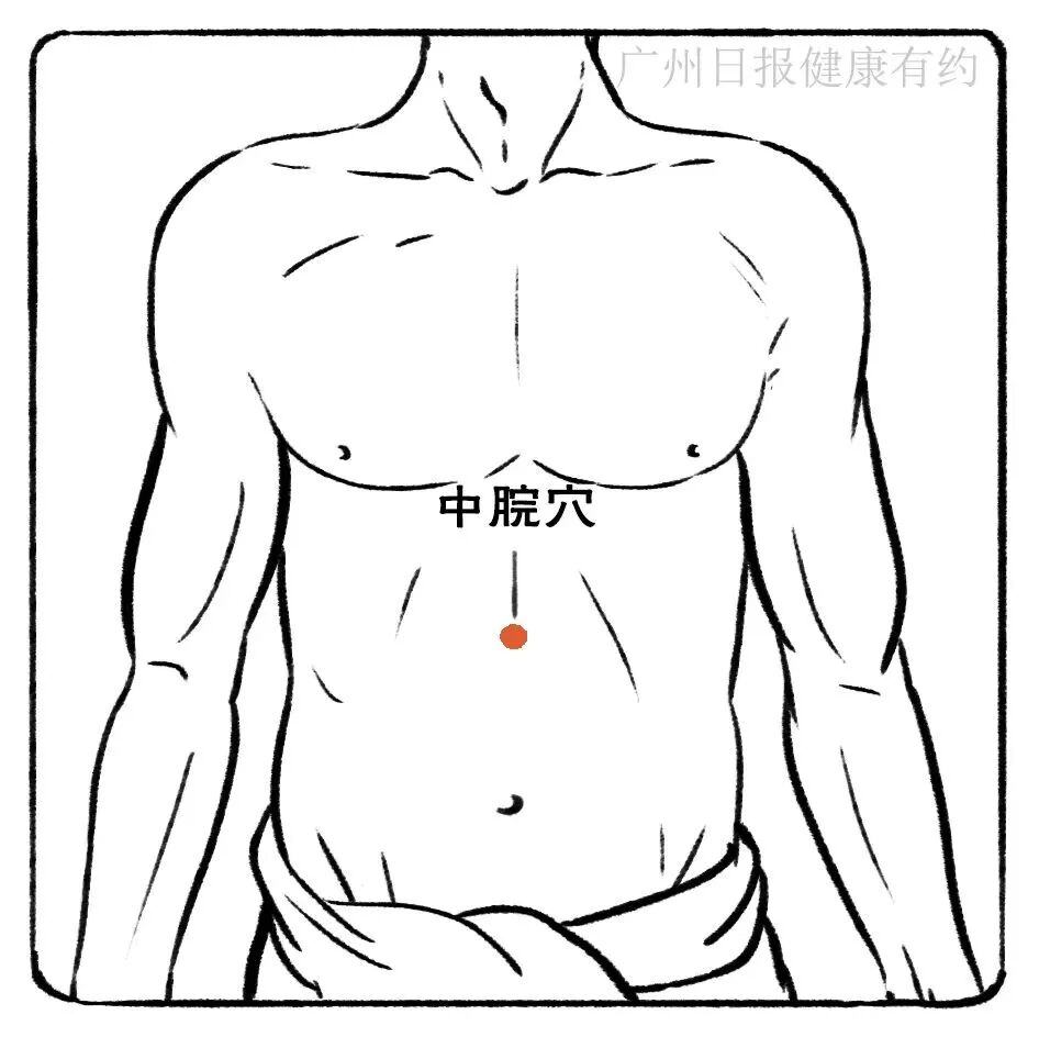 中脘穴在上腹部,前正中线上,脐中上4寸,具有和胃健脾的作用。