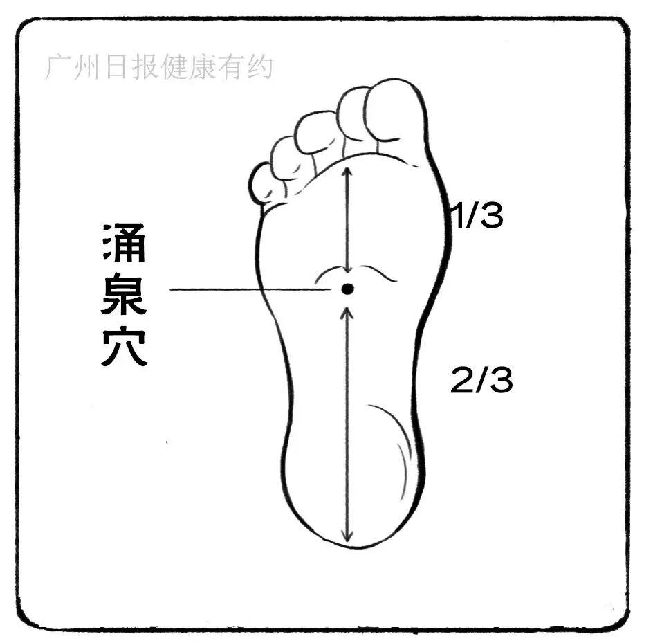 涌泉穴位于足底前部凹陷处2、3 趾趾缝纹头端与足跟连线的前1/3处。可以缓解失眠、头晕头痛。