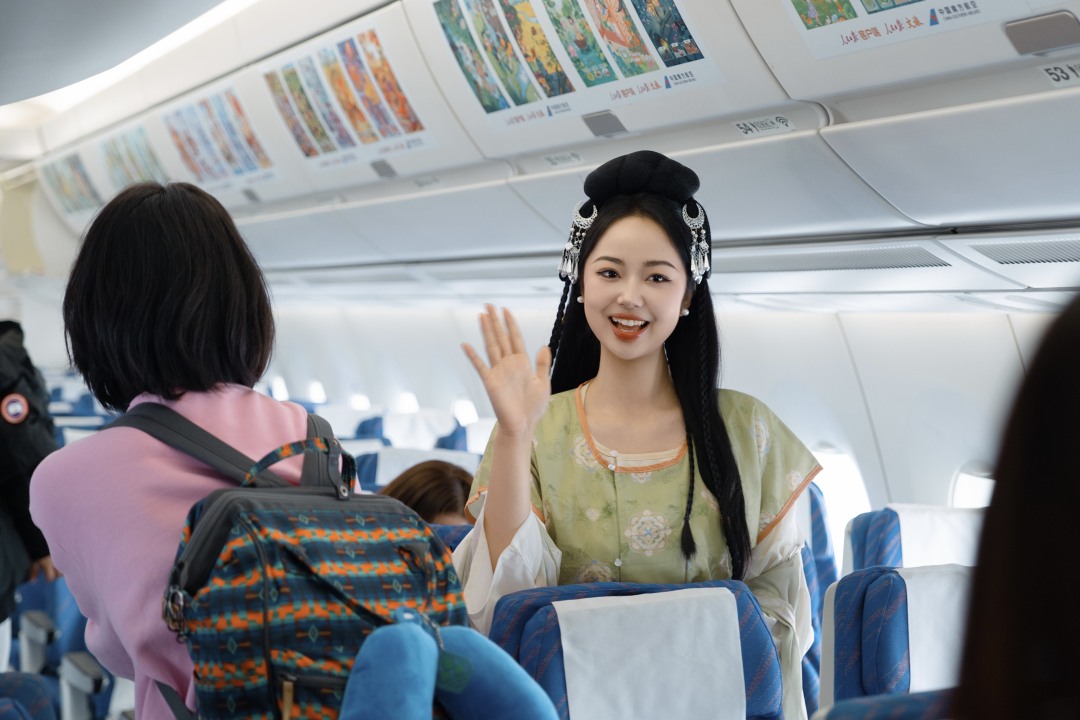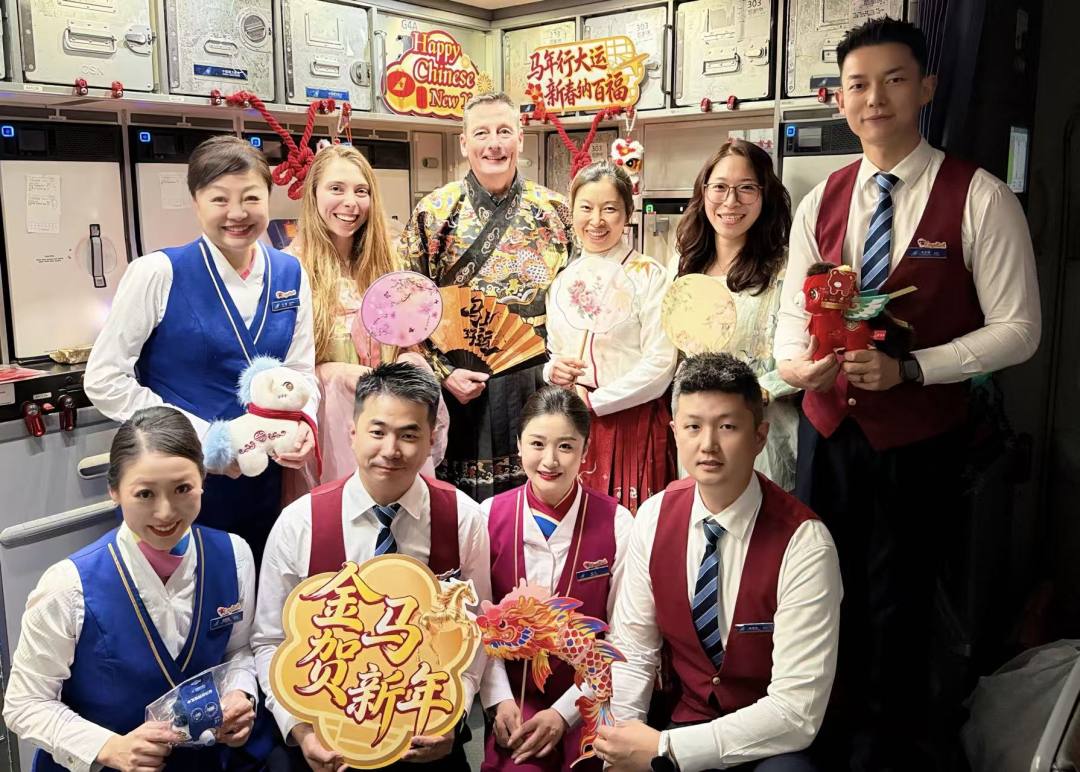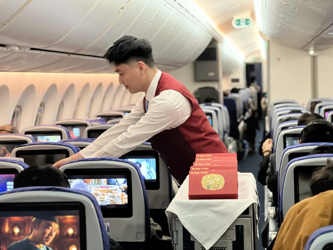 春节期间,南航在15个国际航班上开展“木棉新禧”暨“云端中国年 幸福新航程”主题航班系列活动,客舱内装饰二十四节气海报、福字贴、红灯笼,处处洋溢着喜庆祥和的节日氛围。其中,在广州至阿姆斯特丹航班上展示汉服雅韵,邀请外籍旅客沉浸式感受中华优秀传统文化的独特韵味。在广州至伦敦航班上,乘务员向旅客们展示团扇、生肖玩偶,用双语讲述年俗故事。在广州至奥克兰航班上,邀请中外旅客当“财神”,为航班上的旅客送上节日祝福。