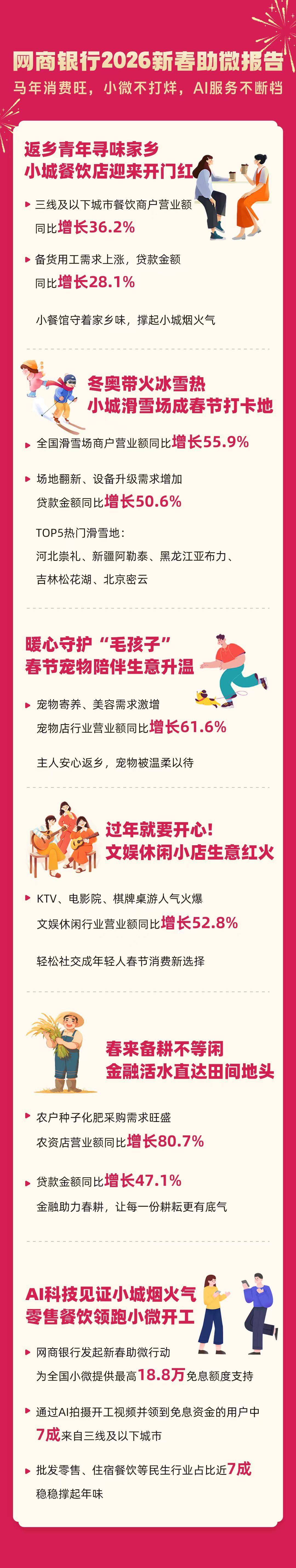 2月24日,网商银行发布2026年新春助微报告。报告显示,马年春节呈现“居民消费热、小微经济活、金融服务不断档”的新气象:返乡经济、冰雪旅游、宠物经济等新消费多点开花,三线及以下城市小微经济活力凸显。与此同时,网商银行通过AI技术精准识别小微经营者开工情况,春节期间金融服务“不打烊”,为他们提供免息资金支持,其中七成流向三线及以下城市和县域,让小店开工更有底气。