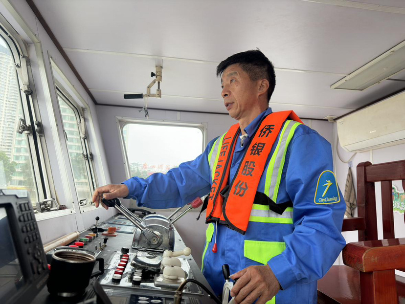 上午八点,冬日的阳光照射在珠江水面上,泛起层层鳞光。广州市本级一体化项目水上环卫工人刘芳春驾驶着智能保洁船缓缓驶离码头开展定点式巡回保洁。