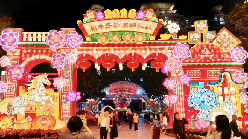 福马迎春来贺岁。今年元宵灯会最引人注目的彩灯,当属正门门楼的《福马迎春》。该组彩灯主体巧妙融合了骑楼拱券、趟栊门、满洲窗,以及广彩花瓶等丰富的广府元素,彰显出浓厚的地域特质。左侧骏马于趟拢门前昂首跃起,呼应农历马年,搭配“福”字、橙子等元素,蕴含马上“橙”功、马上有“福”等意义。右侧则嵌入西关花窗、天球瓶、葫芦瓶、牡丹赏盘等本土元素,寓意福禄双全、花开富贵的传统好“意头”。该门楼灯组用现代彩灯工艺诠释岭南风貌,生动呈现出“老城市新活力”的荔湾新春画卷。