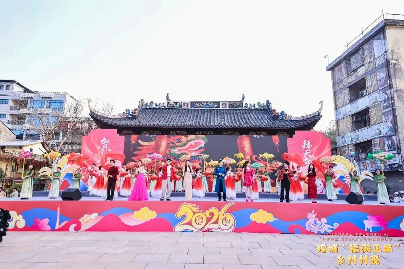 “村晚”现场,年货展销、年食飘香、年俗巡游、年欢晚会四大板块交织串联,全景呈现“沉浸式”岭南年味。畲族“凤凰装”绚丽夺目,派潭舞鱼灯轻盈游弋,宁西冯村龙狮会再现全运会开幕式风采,非遗美食云吞、濑粉热气腾腾……一场“村晚”,是乡村文化的集中展演,更是乡村振兴成果的立体汇报。