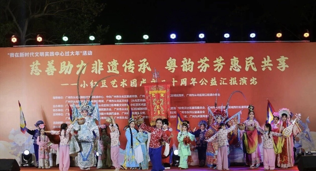 2月11日晚,从化河滨灯光球场锣鼓铿锵、粤韵悠扬,“慈善助力非遗传承 粤韵芬芳惠民共享”小红豆艺术团成立二十周年公益汇报演出火热开锣。本次演出精心策划了“红豆初绽·薪火启程”“梨园薪传·韵续南音”“红豆映心·家国同春”三大篇章。民乐合奏《娱乐升平》《得胜令》《双飞蝴蝶》率先奏响,粤剧行当展示《我是一颗小红豆》、诗朗诵《从化小红豆·光辉二十载》、折子戏《仙女散花》等节目轮番登场。粤剧演员们身姿翩跹、唱腔婉转,一招一式尽显功底,赢得台下掌声如潮。