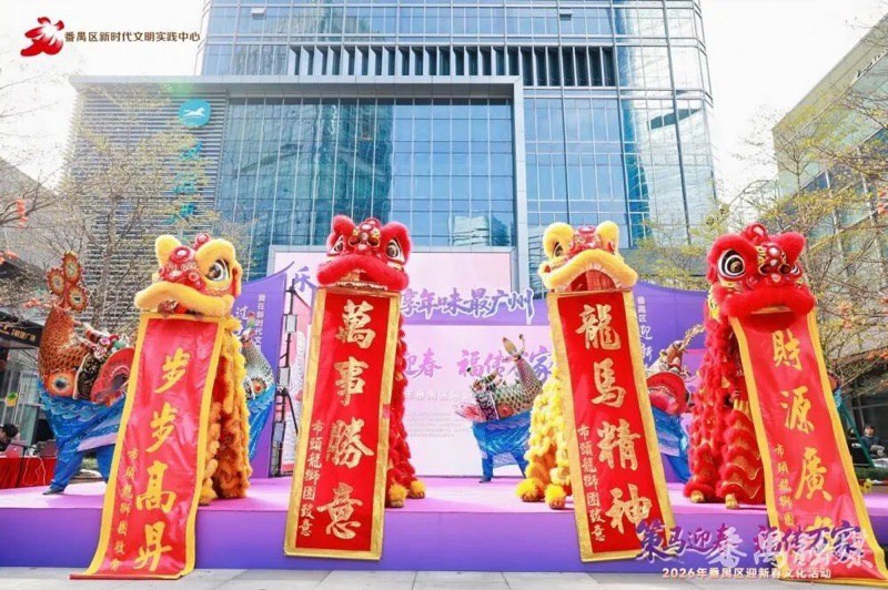 广府味,幸福年。近日,“策马迎春 福传万家”——2026年番禺区迎新春文化活动举行,让市民游客“沉浸式”感受广府文化魅力。活动在《鳌鱼醒狮贺新春》表演中拉开序幕,灵动的鳌鱼、矫健的醒狮,用最具广府特色的方式舞出精气神,送上新春的吉祥祝福。