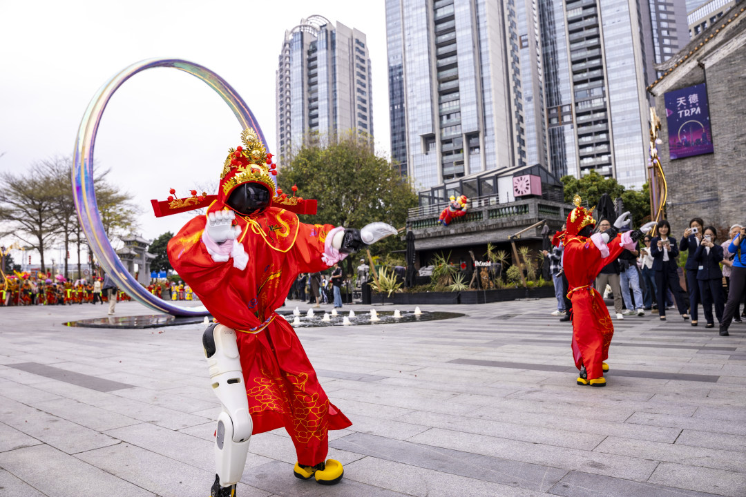 26日上午,参加本次巡游活动的队伍从猎德晟府广场出发,沿路锣鼓喧腾、人气鼎沸,九大特色方阵依次登场,在保留传统民俗内核的同时融入国潮与科技元素,尽显文化新意。现场,盛世龙腾旗阵气势开场,祥龙献瑞、龙狮欢腾方阵活态展现岭南醒狮与舞龙的文化魅力;乾坤扇韵、旗鼓起舞将太极、猎德鼓与武术旗刚柔结合;英歌舞方阵铿锵豪迈,锦绣霓裳汉服方阵古韵雅致。活动更创新加入由机器人扮演的“财神”,让前沿科技与传统民俗趣味相融,成为全场焦点。