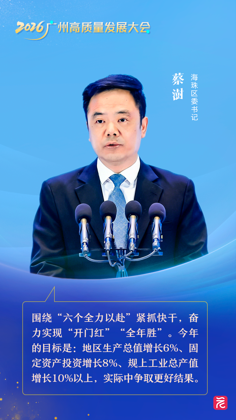 海珠区委书记蔡澍表示,海珠区将围绕“六个全力以赴”紧抓快干,奋力实现“开门红”“全年胜”。今年的目标是地区生产总值增长6%、固定资产投资增长8%、规上工业总产值增长10%以上,在实际中争取更好的结果。