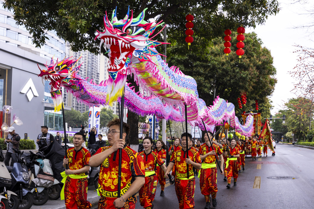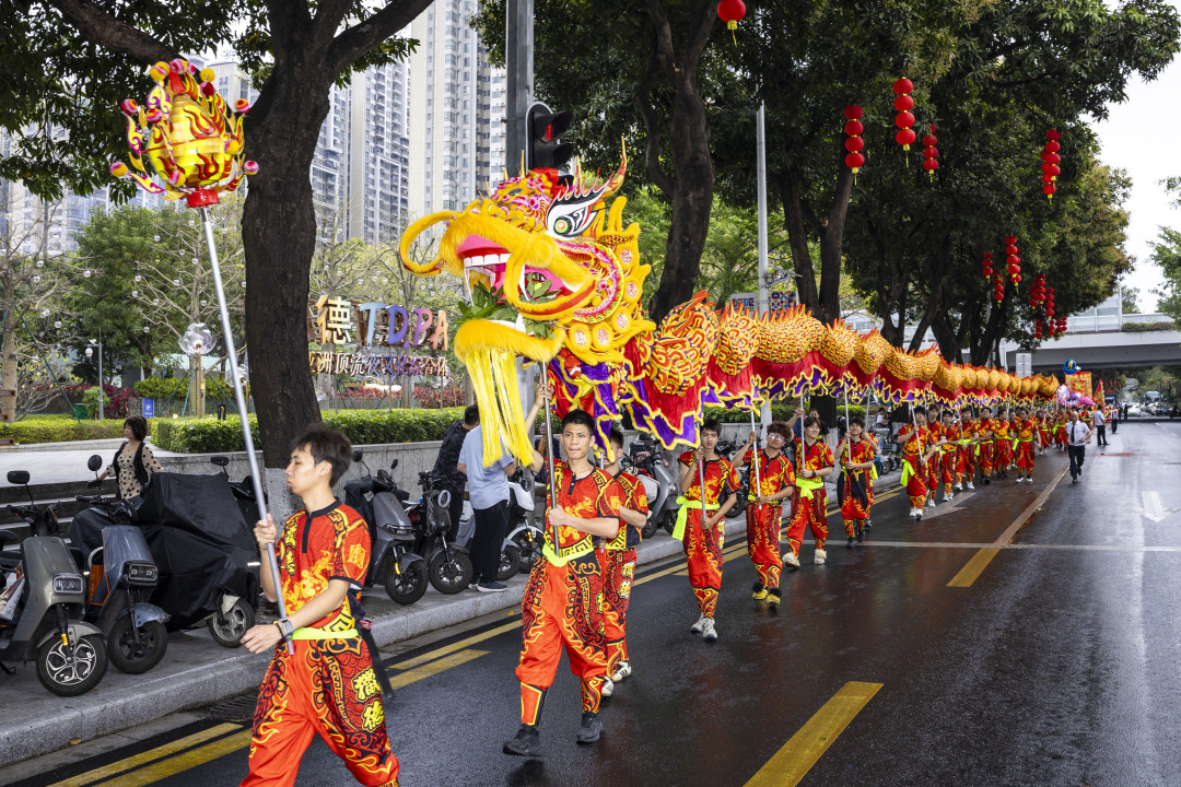大年初十,猎德新春大巡游,舞龙队伍巡游经过临江大道。