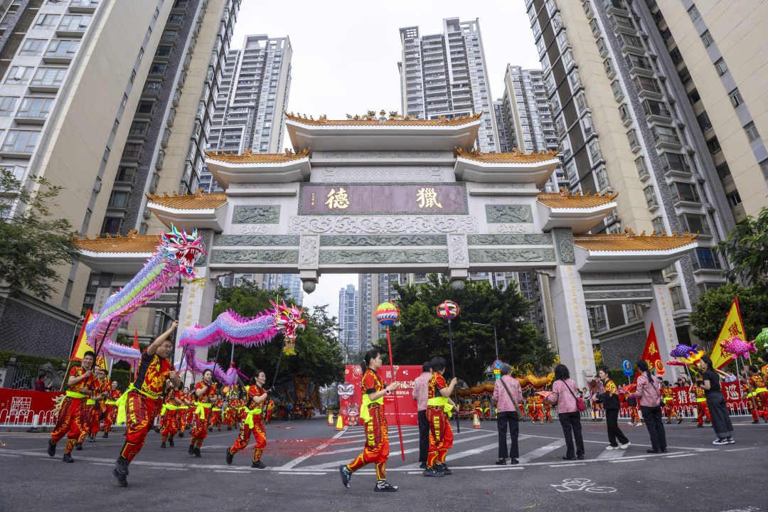 大年初十,猎德新春大巡游,巡游队伍经过猎德牌坊。