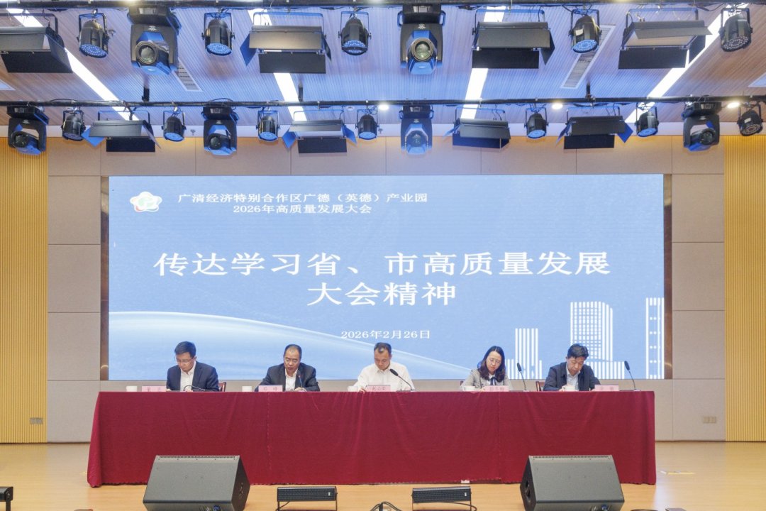 春潮涌动处,奋进正当时。2月26日,在广东省、广州市、清远市高质量发展大会相继擂响战鼓之后,广清经济特别合作区广德(英德)产业园紧跟步伐,召开2026年高质量发展大会,深入学习贯彻上级会议精神,全面总结回顾2025年发展成果,系统部署2026年经济工作,动员园区上下拿出“跃马扬鞭”的闯劲、激发“万马奔腾”的活力、保持“马不停蹄”的干劲,共同开启高质量发展新征程。