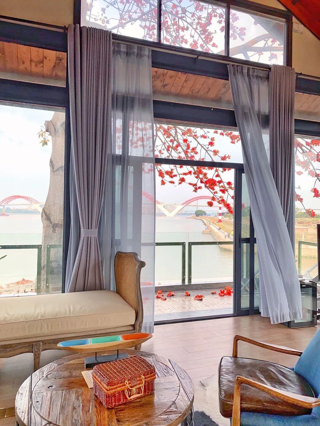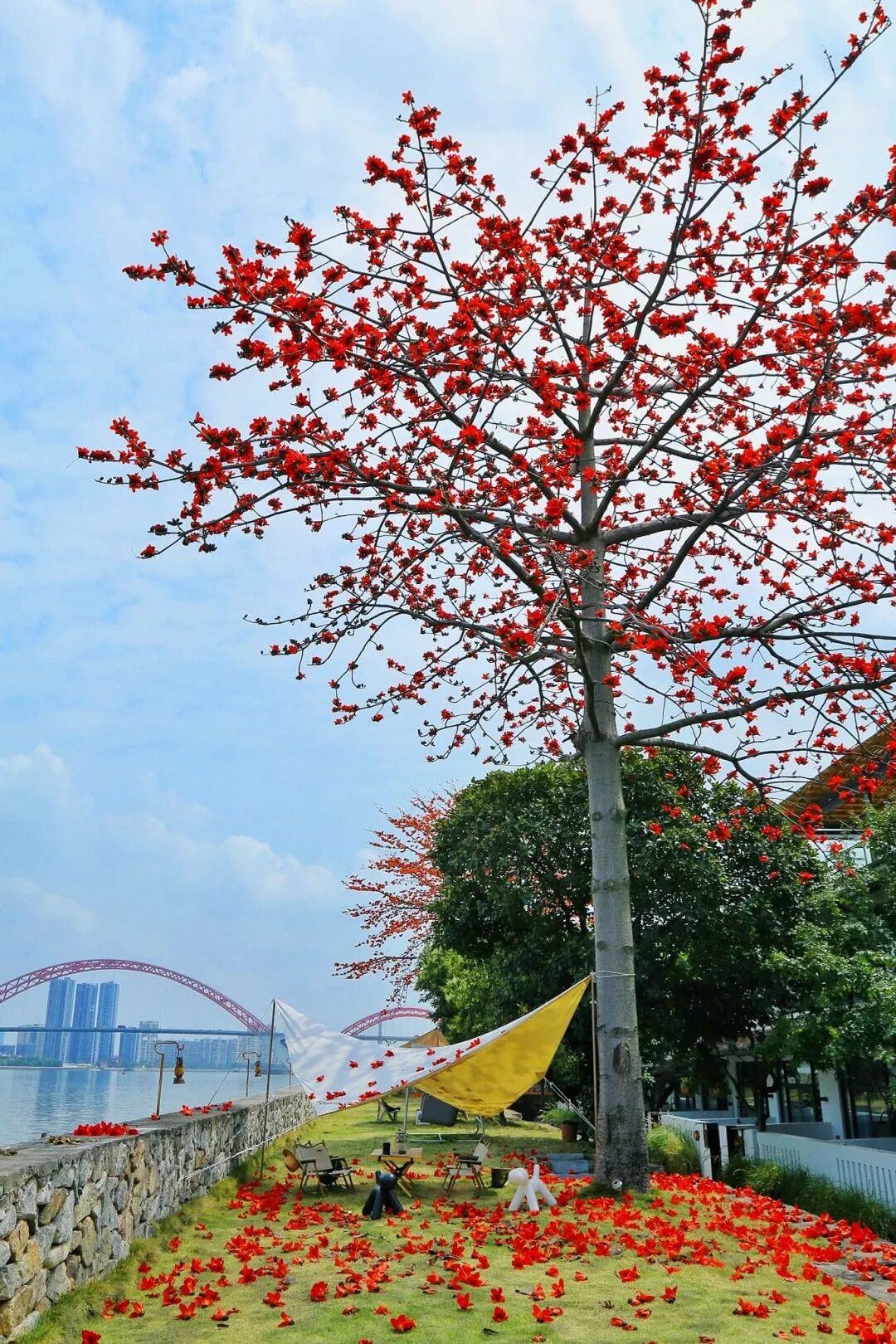 在江边草坪上,落下的红棉点缀着绿茵,你可以坐在摇椅上,静静感受江风拂面,看对岸广州之窗的现代建筑与这株老木棉相映成趣。