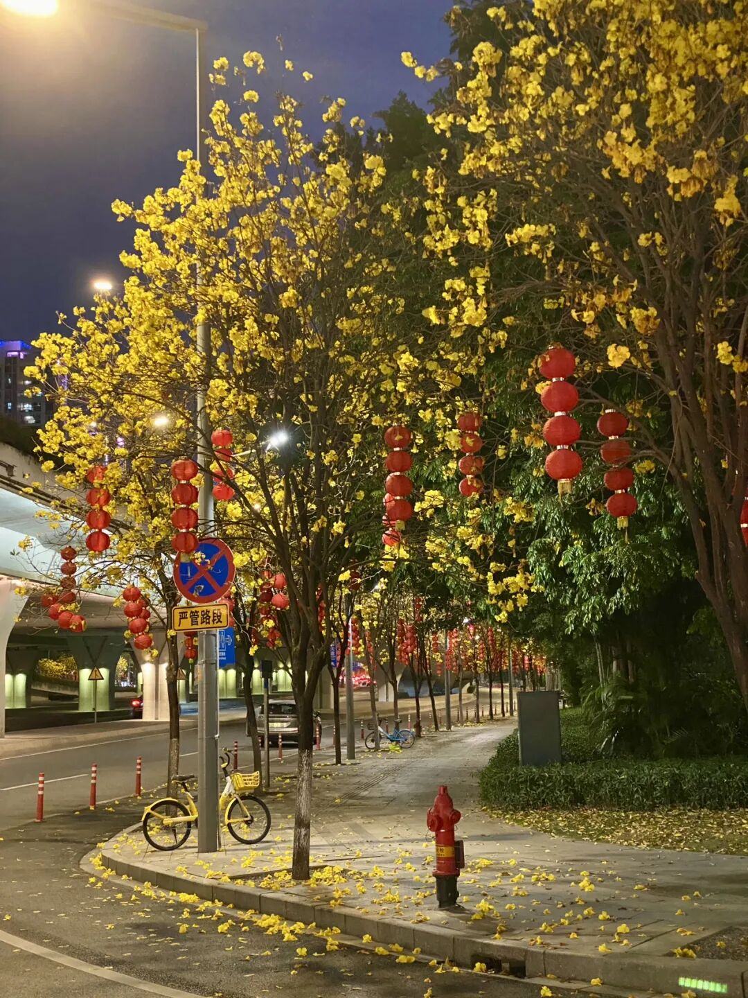▲阅江西路,盛开的黄花风铃木在路灯的照射下金光闪闪,像满树金花。