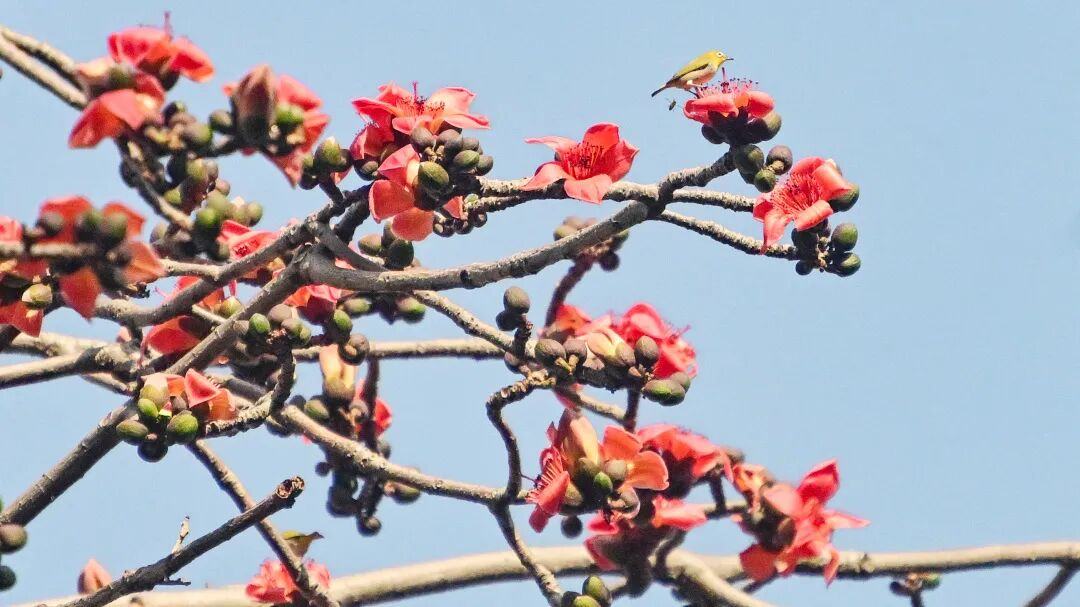 木棉花期从2月中旬持续到3月下旬,不少地方已经进入了盛花期。这种先花后叶的乔木,花开时满树火红,如火炬高擎,落地时依然鲜艳挺拔,不凋不败。