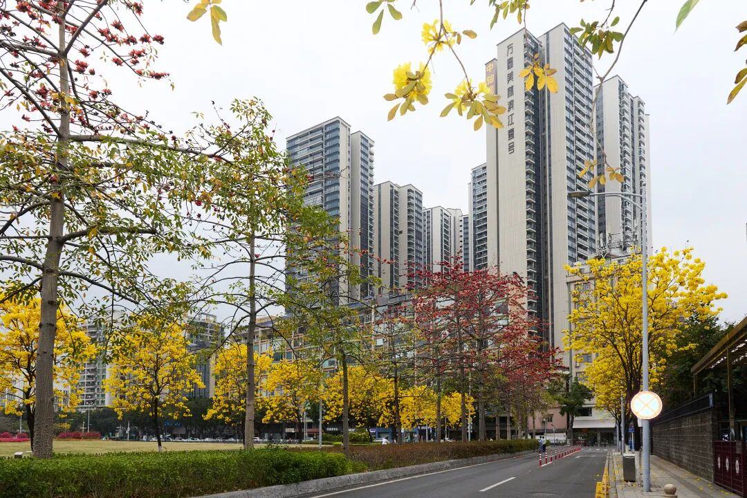 ▲ 海珠区友邻三路附近,黄花风铃木与赤岗塔同框。