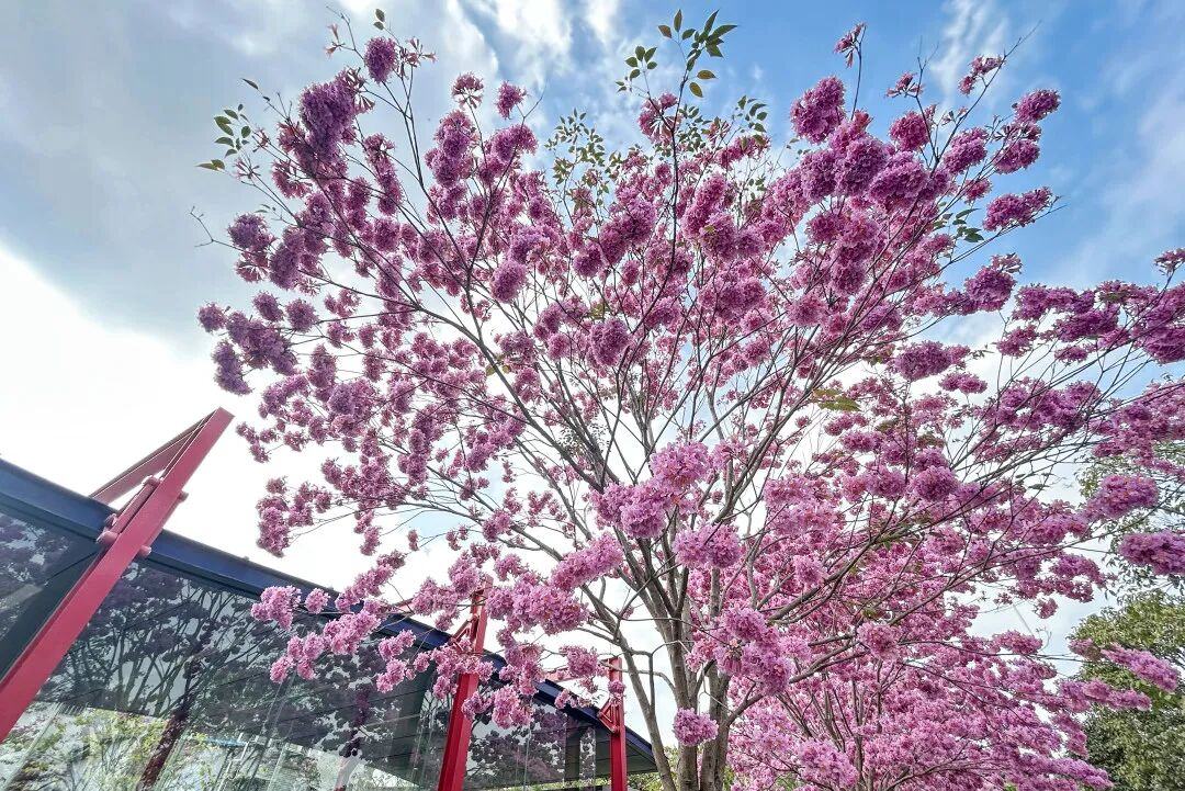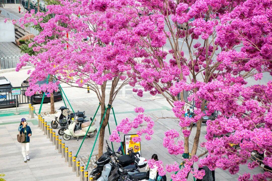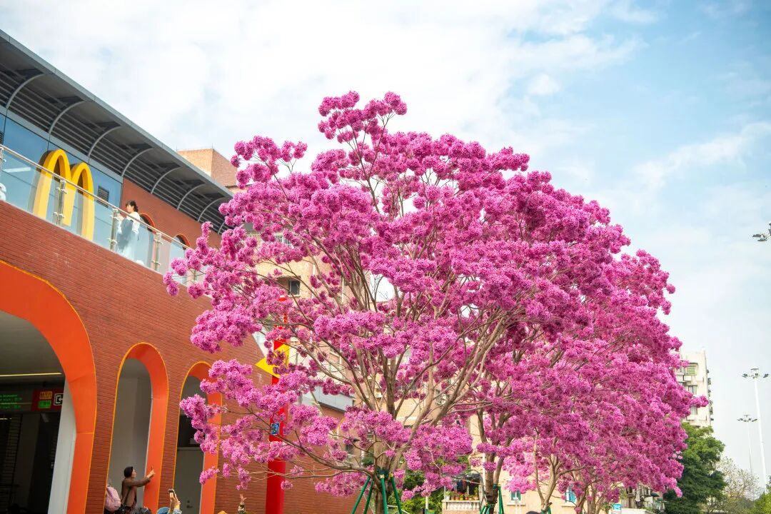今年二月,广州地铁11号线沿线的几个站点成为了新的网红打卡地。沙涌站D口、大冲口站B口、芳村站D口外,紫花风铃木开得泼泼洒洒,将通勤路变成春日秘境。